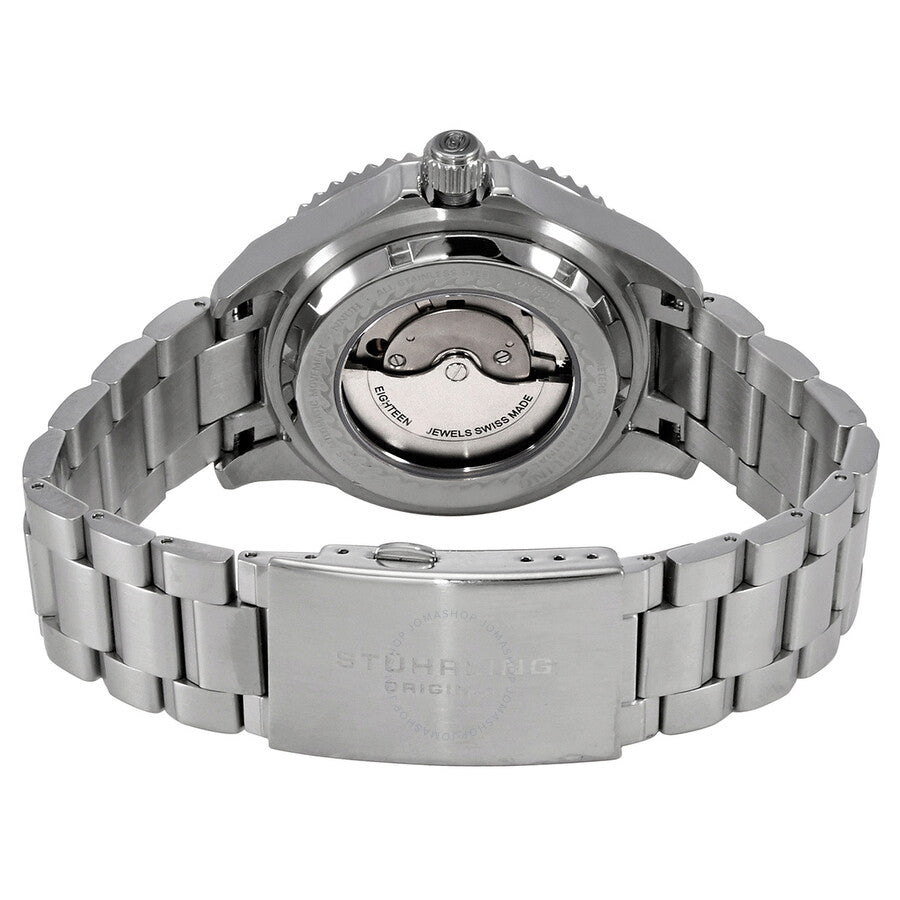 Stainless steel case with a stainless steel bracelet. Uni-directional rotating coin edge stainless steel bezel with a grey and silver ring. Blue dial with luminous silver-tone Breguet-style shape hands and index hour markers. Minute markers around the outer rim. Dial Type: Analog. Luminescent hands and markers. Date display at the 3 o'clock position. Claro calibre CL888 automatic movement, containing 18 Jewels, bitting at 21600 vph, and has a power reserve of approximately 38 hours. Scratch resistant mineral crystal. Screw down crown. Transparent case back. Round case shape. Case size: 42 mm. Case thickness: 11.8 mm. Band length: 8.6 inches. Deployment clasp with a push button release. Water resistant at 200 meters / 660 feet. Functions: date, hour, minute, second. Dive watch style. Watch label: Swiss Movt. Stuhrling Original Aquadiver Automatic Silver Dial Men's Watch Stuhrling Original Aquadiver Automatic Silver Dial Men's Watch M13520