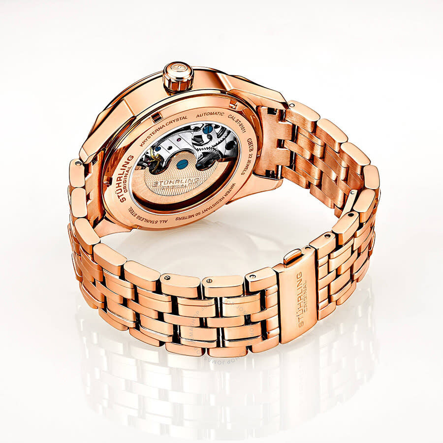 Rose gold-tone stainless steel case with a rose gold-tone stainless steel bracelet. Fixed rose gold-tone stainless steel bezel. Silver-tone dial with rose gold-tone alpha-style shape hands and index hour markers. Minute scale around the inner rim. Dial Type: Analog. Two - day/night indicator & dual time subdials. Automatic movement. Scratch resistant krysterna crystal. Pull / push crown. Transparent case back. Round case shape, case size: 42 mm, case thickness: 12.5 mm. Band length: 7.5 inches. Deployment with push button release clasp. Water resistant at 50 meters / 165 feet. Functions: hour, minute, dual time, day/night. Dress watch style. Stuhrling Original Legacy Automatic Silver Dial Men's Watch Stuhrling Original Legacy Automatic Silver Dial Men's Watch M13481