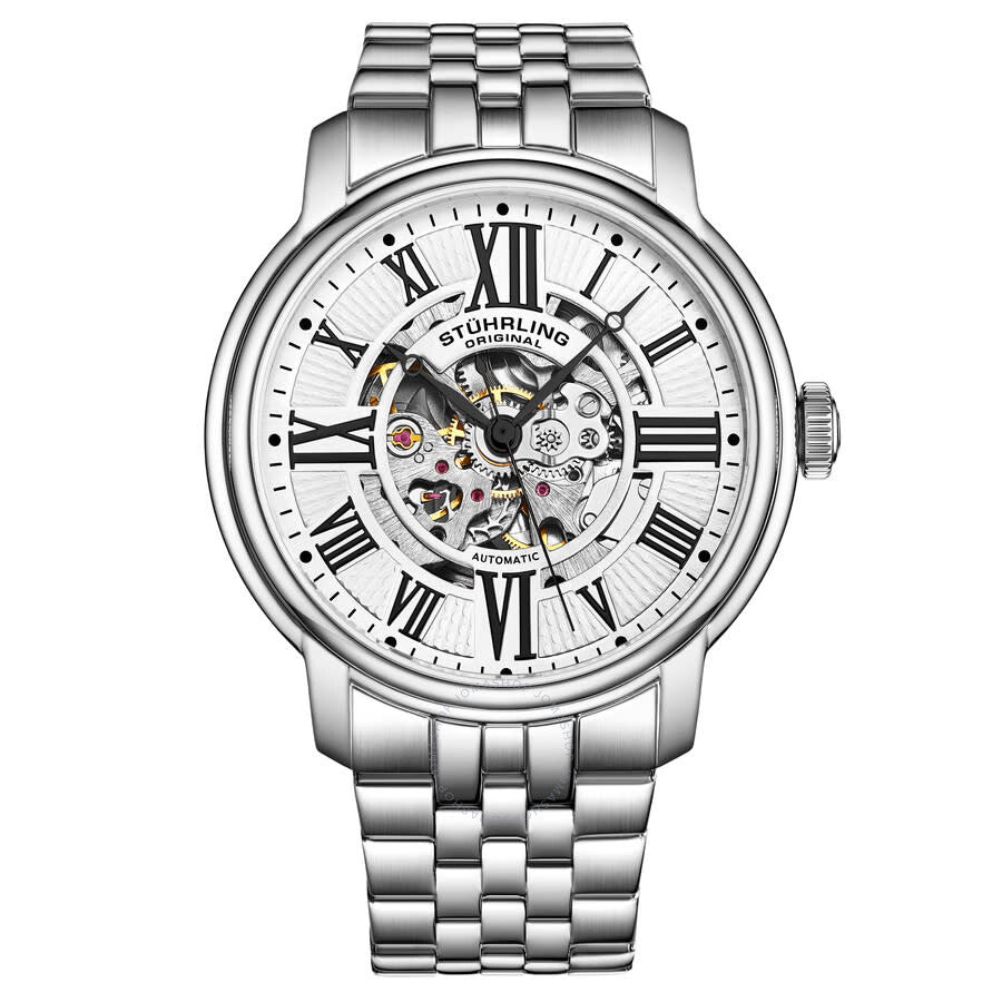 Men's Automatic Watch, Silver Tone Case on Five Row Brushed and Polished Silver Tone Bracelet, Silver Tone Skeletonized Dial, with Black Accents. Silver-tone alloy case with a silver-tone stainless steel bracelet. Fixed silver-tone bezel. White dial with black hands and Roman numeral hour markers. Minute markers around the outer rim. Dial Type: Analog. Automatic movement. Round case shape, case size: 42 mm. Deployment with push button release clasp. Water resistant at 50 meters / 165 feet. Functions: hour, minute, second. Legacy Series. Dress watch style. Stuhrling Original Legacy White Dial Men's Watch M17890.