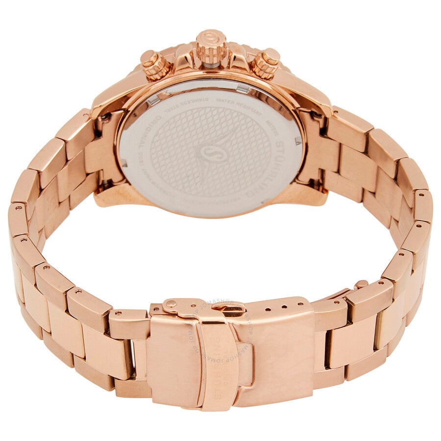 Rose gold-tone alloy case with a rose gold-tone stainless steel bracelet. Fixed rose gold-tone alloy bezel. Black dial with luminous rose gold-tone hands and alternating Arabic numeral and index hour markers. Tachymeter markers around the outer rim. Dial Type: Analog. Luminescent hands and markers. Date display at the 4 o'clock position. Quartz movement. Scratch resistant mineral crystal. Pull / push crown. Solid case back. Round case shape. Case size: 40 mm. Case thickness: 12 mm. Fold over clasp with a safety release. Water resistant at 100 meters / 330 feet. Functions: chronograph, tachymeter, date, hour, minute, second. Monaco Series. Sport watch style. Stuhrling Original Monaco Black Dial Men's Watch M15794.