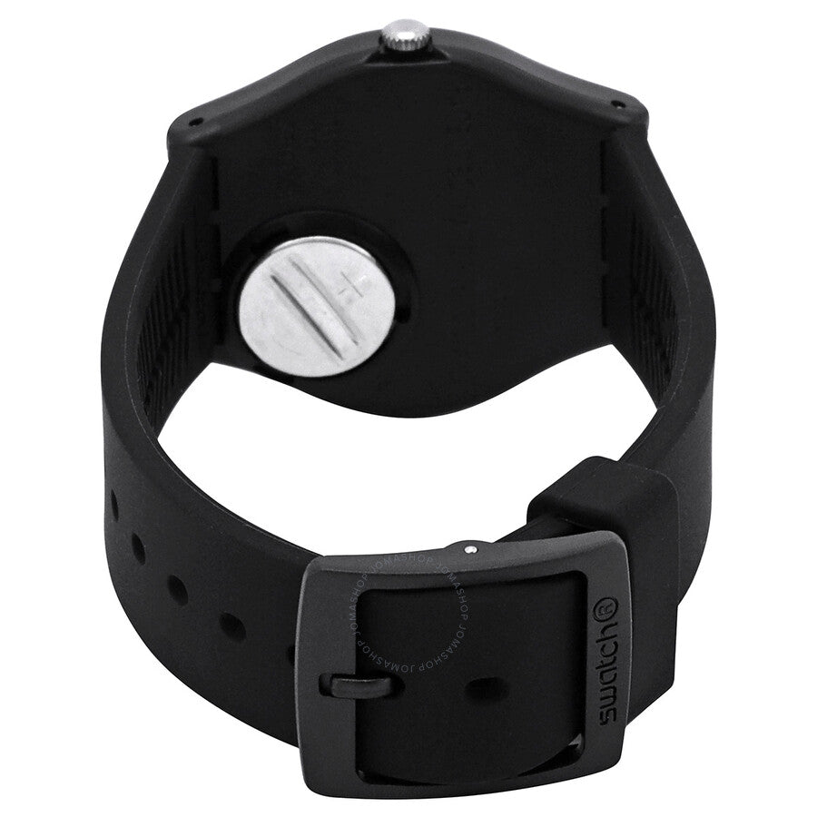 Black plastic case with a white silicone strap. White dial with grey hands. No markers. Dial Type: Analog. Quartz movement. Scratch resistant plexiglass crystal. Pull / push crown. Solid case back. Round case shape, case size: 34 mm, case thickness: 9 mm. Buckle clasp. Water resistant at 30 meters / 100 feet. Functions: hour, minute. Always There Series. Casual watch style. Swatch Always There Quartz White Dial Unisex Watch GB328.