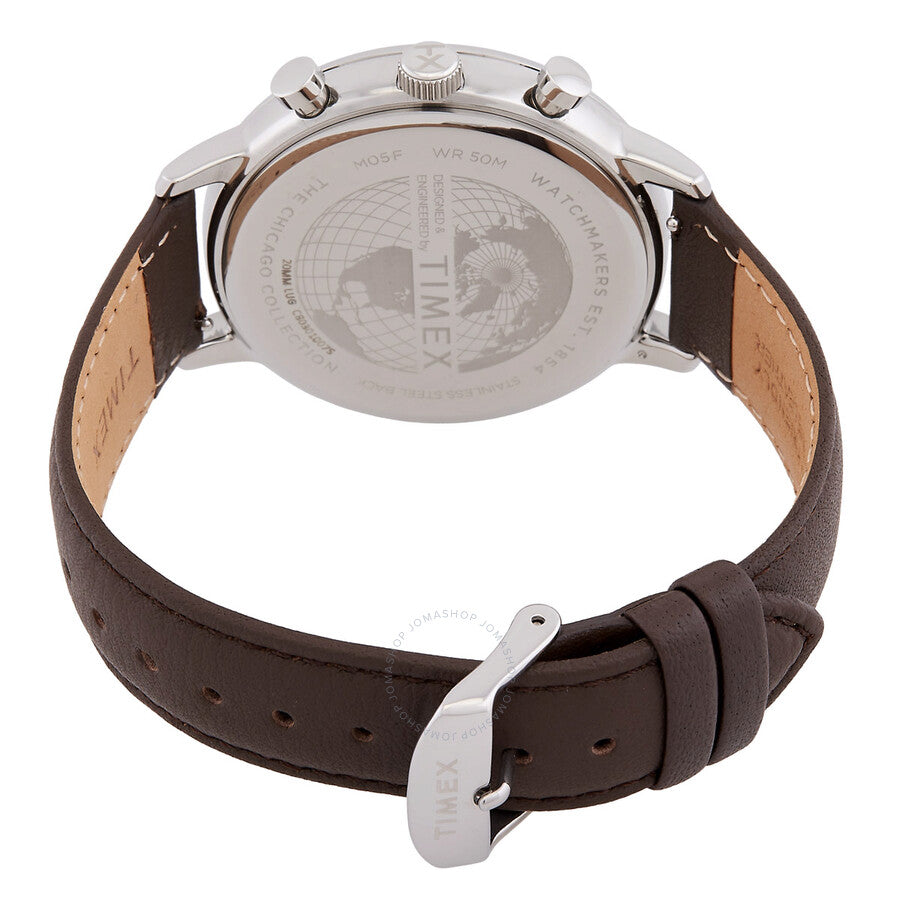 Silver-tone brass case with a brown leather strap. Fixed silver-tone brass bezel. Blue dial with silver-tone hands and index hour markers. Minute markers around the outer rim. Dial Type: Analog. Date display at the 3 o'clock position. Chronograph - three sub-dials displaying: 60 second, 30 minute and 24 hour. Quartz movement. Scratch resistant mineral crystal. Pull / push crown. Solid case back. Round case shape, case size: 45 mm, case thickness: 11 mm. Band width: 20 mm. Buckle clasp. Water resistant at 50 meters / 165 feet. Functions: chronograph, date, hour, minute, second. Chicago Series. Sport watch style. Item Variations: TW2W76200VQ. Timex Chicago Chronograph Quartz Blue Dial Men's Watch TW2W76200.