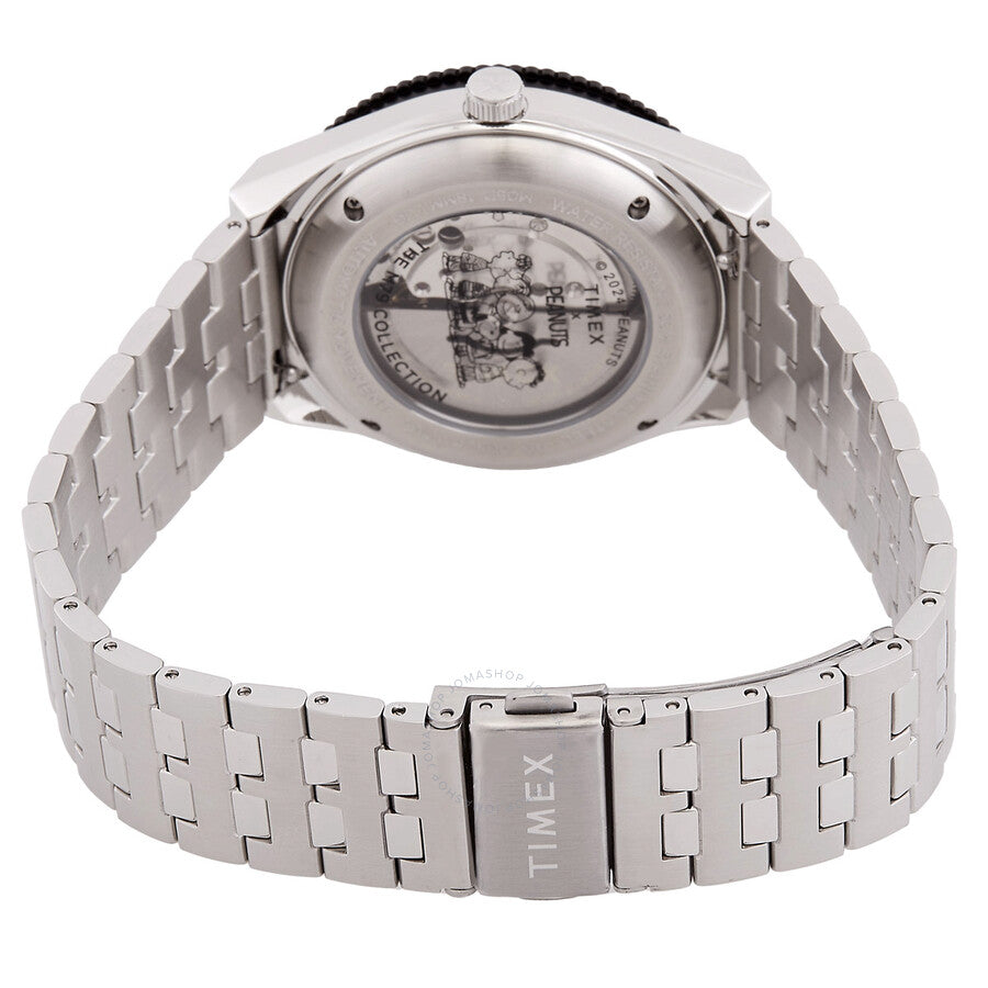 Silver-tone stainless steel case and bracelet. Uni-directional rotating blue and red stainless steel bezel. Blue dial with silver-tone hands and index hour markers. Minute markers around the outer rim. Dial Type: Analog. Luminescent hands and markers. Day of the week and date display at the 3 o'clock position. Automatic movement. Scratch resistant acrylic crystal. Pull / push crown. Transparent case back. Round case shape, case size: 40 mm, case thickness: 14.5 mm. Band width: 18 mm. Deployment clasp. Water resistant at 50 meters / 165 feet. Functions: date, day, hour, minute, second. M79 Series. Casual watch style. Watch label: Japan Movt. Item Variations: TW2W475000Q. Timex M79 X Peanuts Automatic Blue Dial Men's Watch TW2W475000.