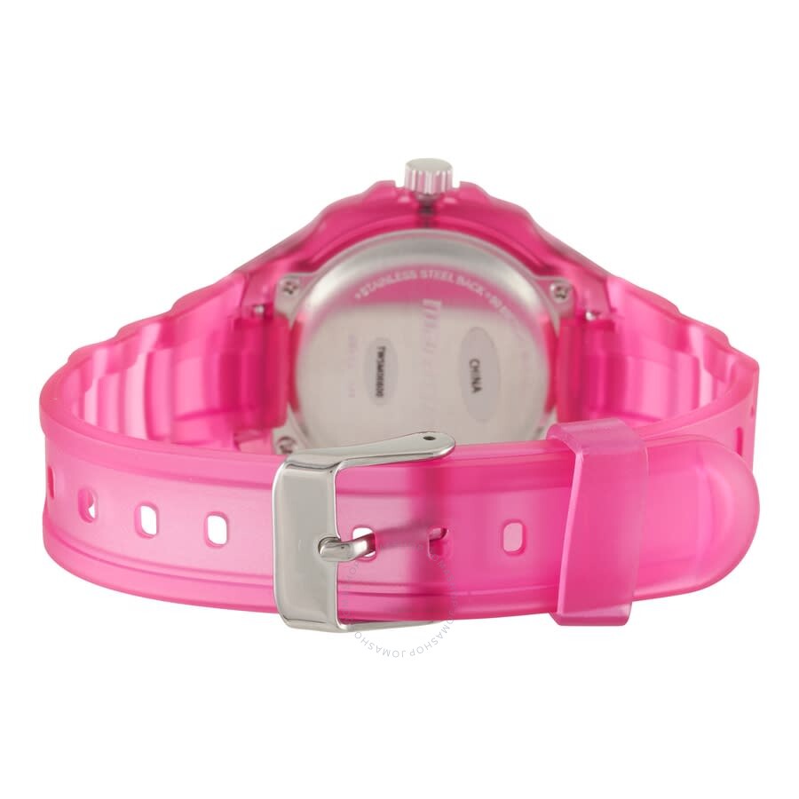 Purple (translucent) resin case and strap. Uni-directional rotating purple (translucent) resin bezel. White dial with silver-tone hands and Arabic numeral hour markers. Minute markers around the outer rim. Dial Type: Analog. Quartz movement. Scratch resistant mineral crystal. Pull / push crown. Solid case back. Round case shape. Case size: 35 mm. Case thickness: 9 mm. Strap width: 12 mm. Tang clasp. Water resistant at 50 meters / 165 feet. Functions: hour, minute, second. Marathon Purple Series. Luxury watch style. Timex Marathon Purple Quartz White Dial Ladies Watch TW5M06600