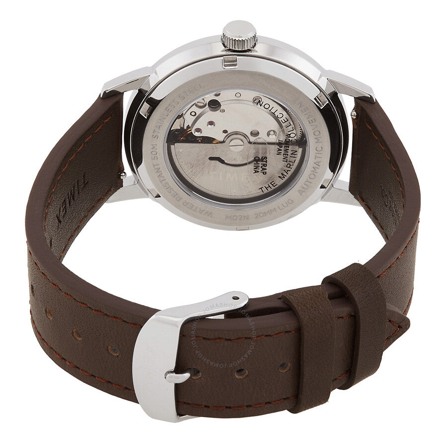 Silver-tone stainless steel case with a brown leather strap. Fixed silver-tone stainless steel bezel. Blue dial with silver-tone hands and index-Arabic numeral hour markers. Minute markers around the outer rim. Dial Type: Analog. Automatic movement. Scratch resistant acrylic crystal. Pull / push crown. Transparent case back. Round case shape, case size: 40 mm, case thickness: 13 mm. Band width: 20 mm. Buckle clasp. Water resistant at 50 meters / 165 feet. Functions: hour, minute, second. Marlin Series. Casual watch style. Item Variations: TW2V44500ZV. Timex Marlin Automatic Blue Dial Men's Watch TW2V44500.