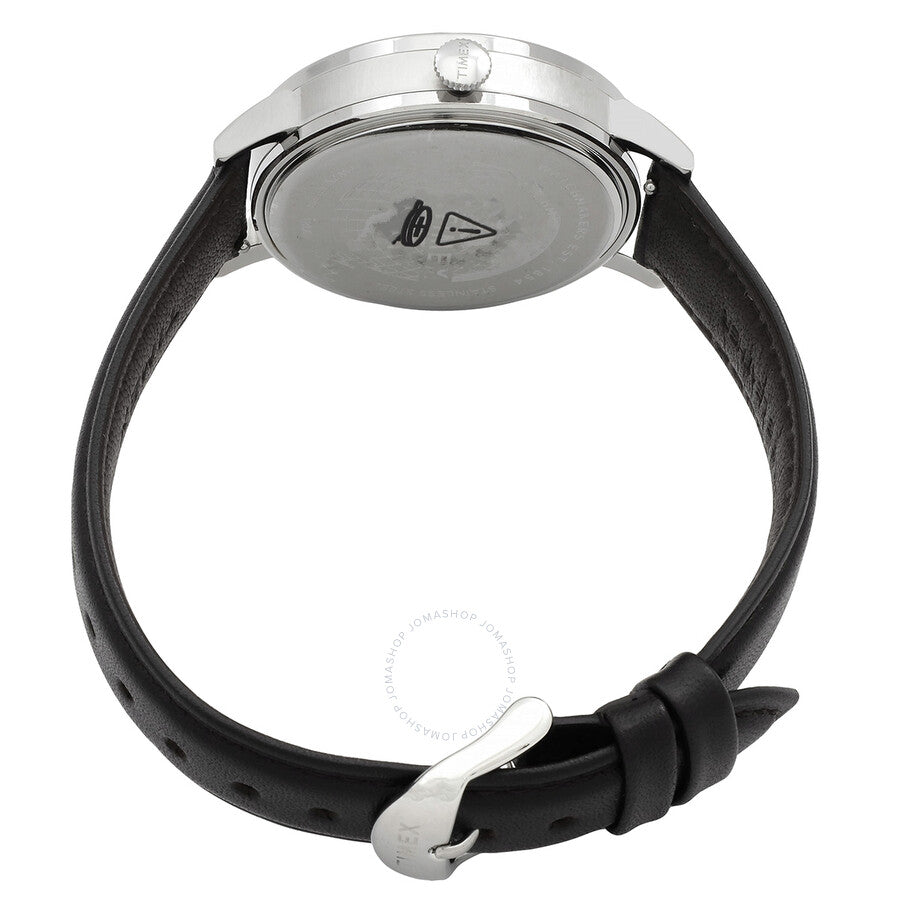 Silver-tone stainless steel case with a brown leather strap. Fixed silver-tone stainless steel bezel. Blue dial with silver-tone hands and index hour markers. Minute markers around the outer rim. Dial Type: Analog. Date display at the 3 o'clock position. Quartz movement. Scratch resistant mineral crystal. Pull / push crown. Solid case back. Round case shape, case size: 38 mm. Buckle clasp. Water resistant at 50 meters / 165 feet. Functions: date, hour, minute, second. Midtown Series. Casual watch style. Timex Midtown Quartz Blue Dial Men's Watch TW2V36500.