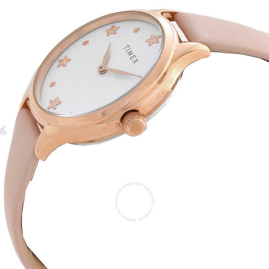 Rose gold-tone brass case with a pink leather strap. Fixed rose gold-tone brass bezel. White dial with floral hour markers. Dial Type: Analog. Quartz movement. Scratch resistant mineral crystal. Pull / push crown. Solid case back. Round case shape, case size: 36 mm, case thickness: 10 mm. Band width: 14 mm. Buckle clasp. Water resistant at 30 meters / 100 feet. Functions: hour, minute. Peyton Series. Casual watch style. Timex Peyton Quartz White Dial Ladies Watch TW2V23700.
