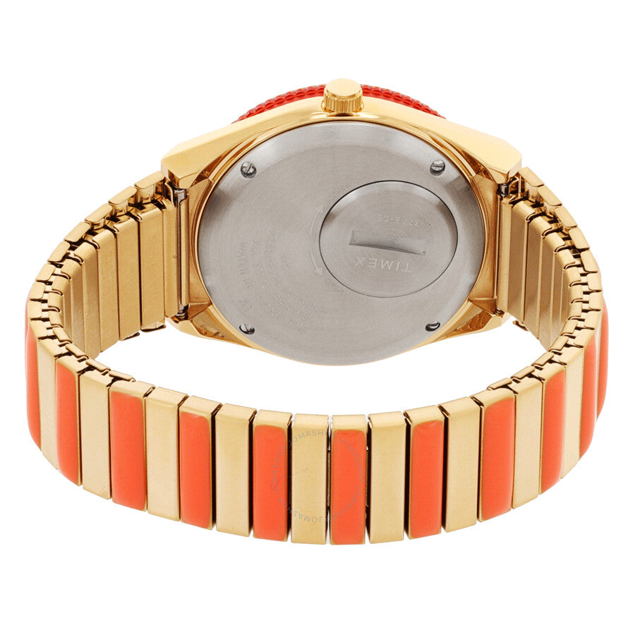 Gold-tone stainless steel case with a two-tone (orange and gold-tone) stainless steel bracelet. Fixed pink and orange stainless steel bezel. Black dial with silver-tone hands and index hour markers. Minute markers around the outer rim. Dial Type: Analog. Day of the week and date display at the 3 o'clock position. Quartz movement. Scratch resistant acrylic crystal. Pull / push crown. Solid case back. Round case shape, case size: 36 mm, case thickness: 12 mm. Band width: 16 mm. Water resistant at 50 meters / 165 feet. Functions: date, day, hour, minute, second. Q Timex Malibu Series. Sport watch style. Timex Q Timex Malibu Quartz Black Dial Ladies Watch TW2U81600.