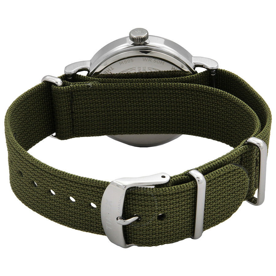 Silver-tone low lead brass case with a green fabric strap. Fixed silver-tone low lead brass bezel. White dial with silver-tone hands and Arabic numeral hour markers. Minute markers around the outer rim. Dial Type: Analog. Date display at the 3 o'clock position. Quartz movement. Scratch resistant mineral crystal. Pull / push crown. Solid case back. Round case shape, case size: 40 mm, case thickness: 10 mm. Band width: 20 mm. Buckle clasp. Water resistant at 50 meters / 165 feet. Functions: date, hour, minute, second, 24 hour. Weekender Series. Casual watch style. Item Variations: TW2W86000VQ. Timex Weekender Quartz White Dial Watch TW2W86000.
