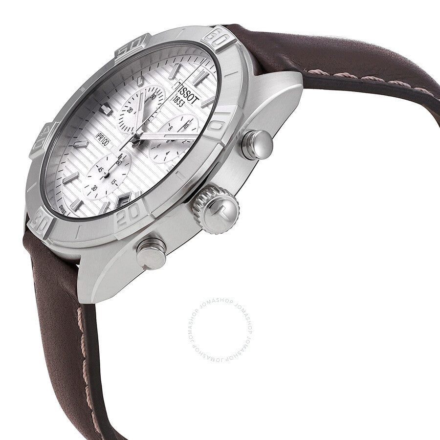 Stainless steel case with a brown (cow) leather strap. Fixed stainless steel bezel. Silver dial with luminous silver-tone hands and index hour markers. Minute markers around the outer rim. Dial Type: Analog. Luminescent hands and markers. Date display between the 4 and 5 o'clock positions. Chronograph - three sub-dials displaying: 60 second, 30 minute and 1/10th of a second. ETA caliber G10.212 quartz movement. Scratch resistant sapphire crystal. Solid case back. Round case shape. Case size: 44 mm. Case thickness: 11.1 mm. Band width: 22 mm. Tang clasp. Water resistant at 100 meters / 330 feet. Functions: chronograph, date, hour, minute, second. Sport watch style. Watch label: Swiss Made. Tissot Chronograph Quartz Silver Dial Men's Watch T101.617.16.031.00.