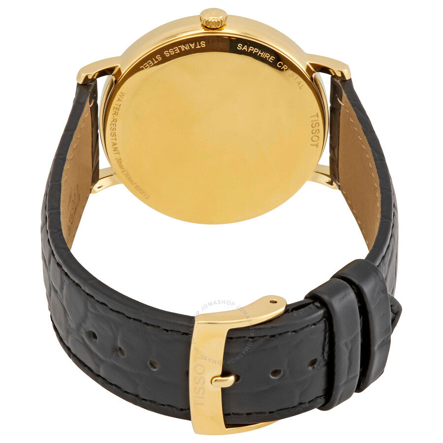 Yellow gold PVD stainless steel case with a black leather strap. Fixed yellow gold PVD bezel. Silver dial with black hands and Roman numeral hour markers. Minute markers around the outer rim. Dial Type: Analog. ETA caliber 902.101 quartz movement. Scratch resistant sapphire crystal. Pull / push crown. Solid case back. Round case shape. Case size: 38 mm. Case thickness: 6.45 mm. Band width: 19 mm. Tang clasp. Water resistant at 30 meters / 100 feet. Functions: hour, minute, second. Casual watch style. Watch label: Swiss Made. Tissot Everytime Medium Quartz Silver Dial Watch T109.410.36.033.00.