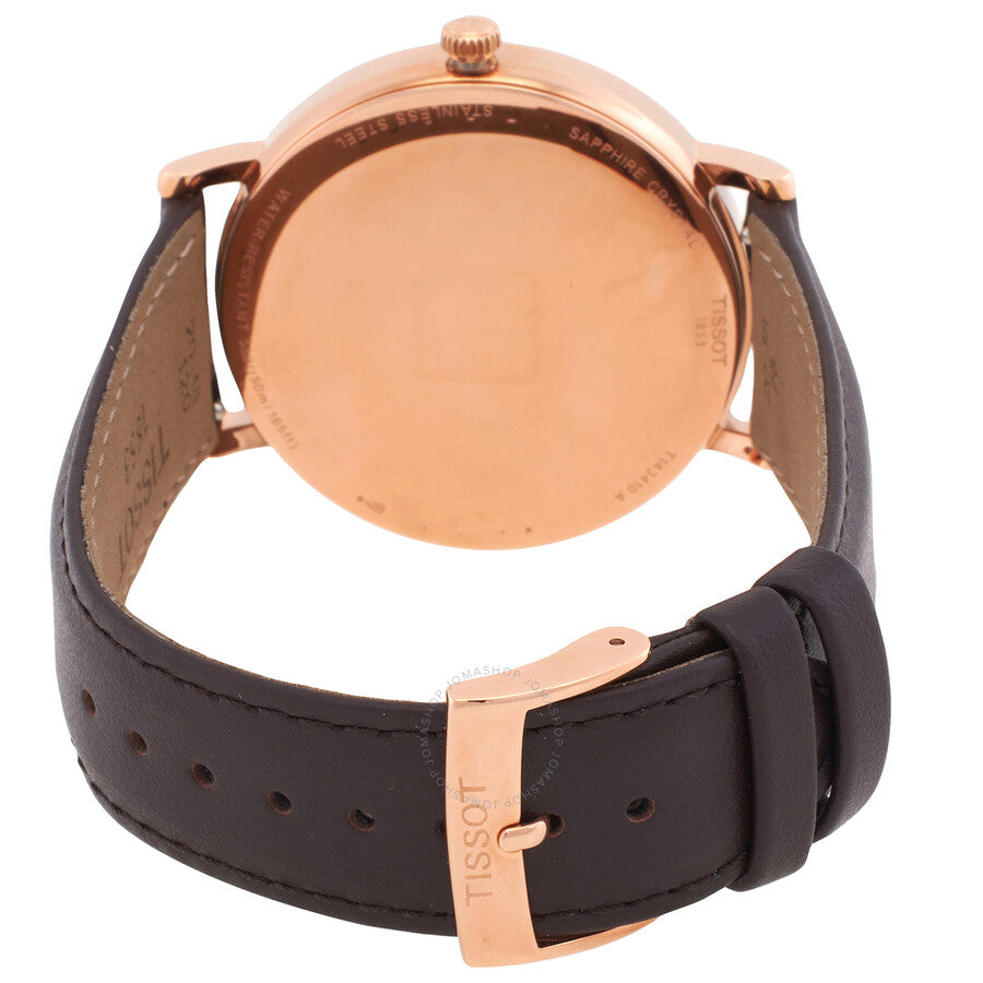 Rose gold PVD stainless steel case with a brown leather strap. Fixed rose gold PVD stainless steel bezel. White dial with rose gold-tone hands and index hour markers. Minute markers around the outer rim. Dial Type: Analog. ETA Caliber F06.412 quartz movement. Scratch resistant sapphire crystal. Pull / push crown. Solid case back. Round case shape, case size: 40 mm, case thickness: 7.1 mm. Band width: 20 mm. Tang clasp. Water resistant at 50 meters / 165 feet. Functions: hour, minute. Everytime Series. Dress watch style. Watch label: Swiss Made. Tissot Everytime Quartz White Dial Unisex Watch T143.410.36.011.00.
