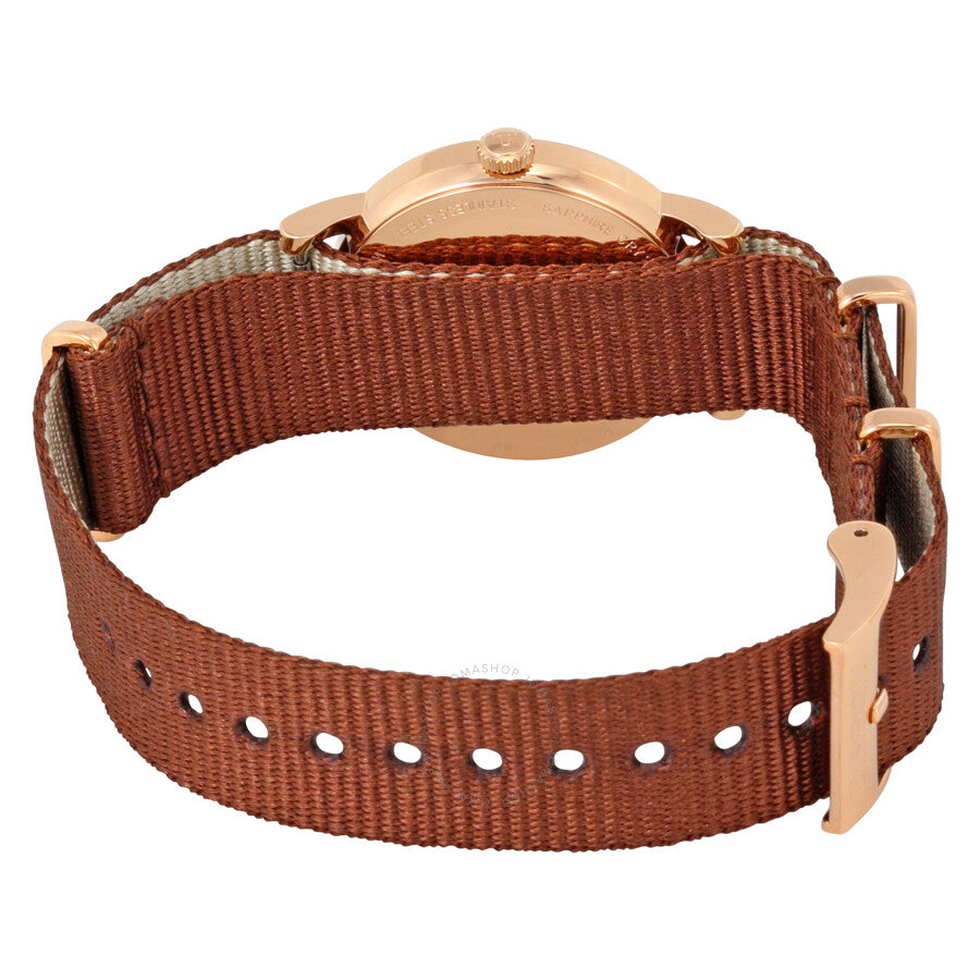 Rose gold PVD stainless steel case with a brown nylon strap. Fixed rose gold PVD bezel. White dial with rose gold-tone hands and index hour markers. Minute markers around the outer rim. Dial Type: Analog. Quartz movement. Scratch resistant sapphire crystal. Pull / push crown. Solid case back. Case size: 30 mm. Case thickness: 6.15 mm. Round case shape. Tang clasp. Water resistant at 30 meters / 100 feet. Functions: hour, minute, second. Casual watch style. Tissot Everytime White Dial Ladies Watch T1092103703100.