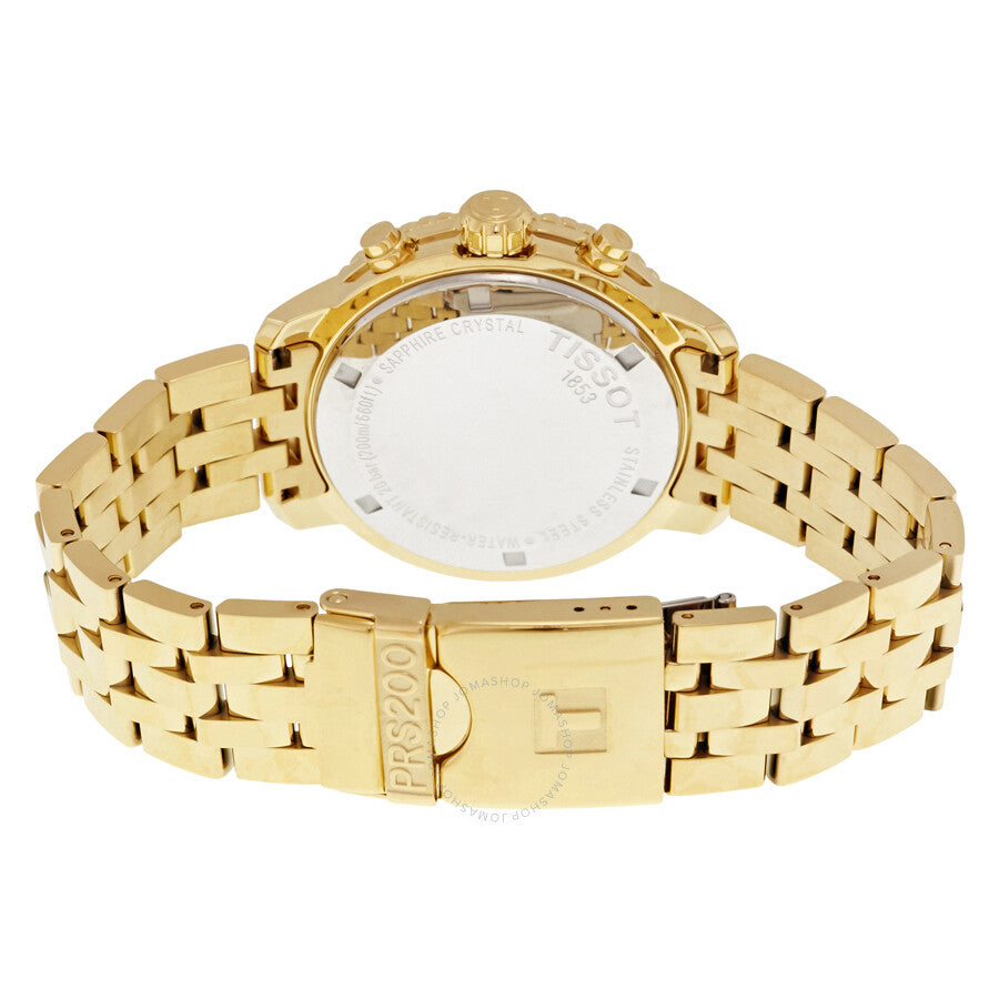 Yellow gold PVD stainless steel case and bracelet. Uni-directional rotating yellow gold PVD bezel with a yellow PVD top ring. Blue dial with luminous yellow gold-tone hands and index / Arabic numeral hour markers. Minute markers. Tachymeter markings around the outer rim. Dial Type: Analog. Luminescent hands and markers. Date display at the 3 o'clock position. Chronograph - three sub-dials displaying: 60 second, 30 minute and 1/10th of a second. ETA caliber G10.212 quartz movement. Scratch resistant sapphire crystal. Screw down crown. Solid case back. Case size: 42 mm. Case thickness: 12.02 mm. Round case shape. Band width: 22.9 mm. Fold over clasp with safety and diver extension. Water resistant at 200 meters / 660 feet. Functions: chronograph, rattrapante, date, hour, minute, small second. Sport watch style. Watch label: Swiss Made. Tissot PRS 200 Chronograph Blue Dial Men's Watch T067.417.33.041.01.