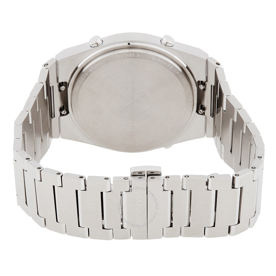 Silver-tone stainless steel case and bracelet. Fixed silver-tone stainless steel bezel. Black dial with Arabic numeral hour markers. Dial Type: digital. Quartz movement. Scratch resistant sapphire crystal. Solid case back. Round case shape, case size: 40 mm. Fold over clasp with a safety release. Water resistant at 100 meters / 330 feet. Functions: date, hour, minute, second. Prx Series. Sport watch style. Watch label: Swiss Made. Tissot PRX Quartz Digital Black Dial Men's Watch T1374631105000.