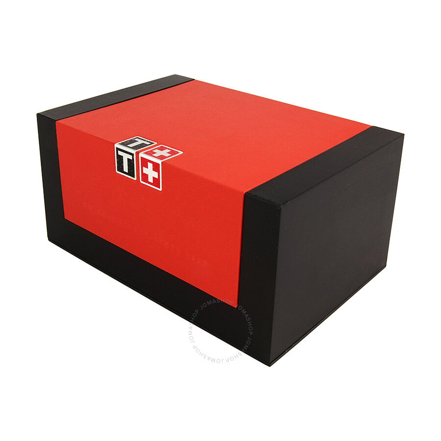 Stainless steel case with a stainless steel bracelet. Blue PVD bezel. Blue dial with luminous hands and dot hour markers. Arabic numerals mark the 6 and 12 o'clock positions. Minute markers around the outer rim. Dial Type: Analog. Luminescent hands and markers. Date display at the 3 o'clock position. Swiss automatic movement. Scratch resistant sapphire crystal. Skeleton case back. Case diameter: 42 mm. Case thickness: 12 mm. Band width: 19 mm. Fold over clasp with safety release. Water resistant at 300 meters / 1000 feet. Casual watch style.