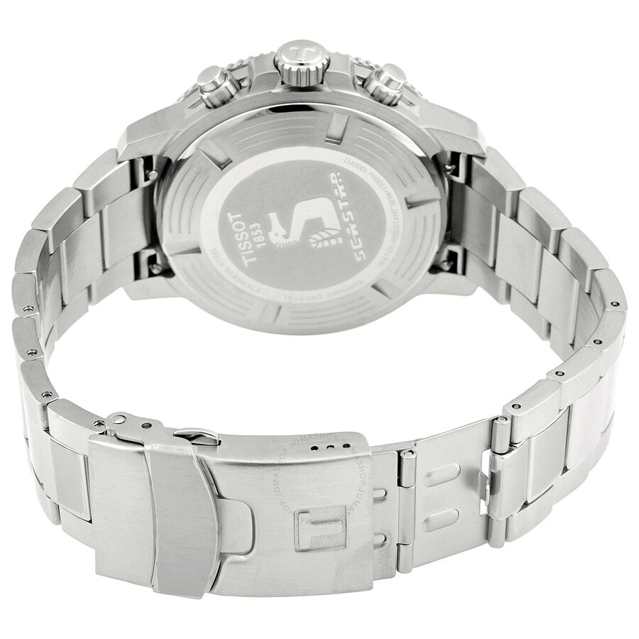 Stainless steel case with a stainless steel bracelet. Uni-directional rotating stainless steel bezel with an inlaid red and blue ceramic ring. Blue dial with luminous grey hands and dot hour markers. Minute markers around the outer rim. Dial Type: Analog. Luminescent hands and markers. Date display between the 4 and 5 o'clock positions. Chronograph - three sub-dials displaying: 60 second, 30 minute and 1/10th of a second. ETA caliber G10.212 quartz movement. Scratch resistant sapphire crystal. Screw down crown. Solid case back. Round case shape. Case size: 45.5 mm. Case thickness: 12.8 mm. Deployment clasp. Water resistant at 300 meters / 1000 feet. Functions: chronograph, date, hour, minute, second. Seastar Series. Casual watch style. Watch label: Swiss Made. Tissot Seastar Chronograph Quartz Blue Dial Men's Watch T120.417.11.041.03.