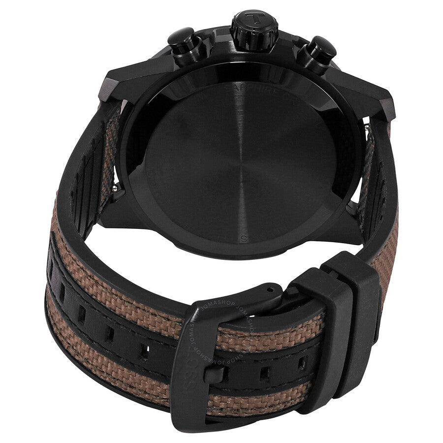 Black PVD stainless steel case with a black leather strap with a (stiched) beige textile top. Fixed black PVD bezel with a black aluminium ring showing tachymeter markings. Black dial with luminous yellow gold hands and index hour markers. Minute markers around the outer rim. Dial Type: Analog. Luminescent hands and markers. Date display at the 6 o'clock position. Chronograph - three sub-dials displaying: 60 second, 30 minute and 1/10th of a second. ETA Caliber G10.212 quartz movement. Scratch resistant sapphire crystal. Solid case back. Round case shape. Case size: 45.5 mm. Case thickness: 11.9 mm. Band width: 22 mm. Tang clasp. Water resistant at 100 meters / 330 feet. Functions: chronograph, rattrapante, date, hour, minute, small second. Supersport Series. Sport watch style. Watch label: Swiss Made. Tissot Supersport Chronograph Quartz Black Dial Men's Watch T125.617.37.051.01.