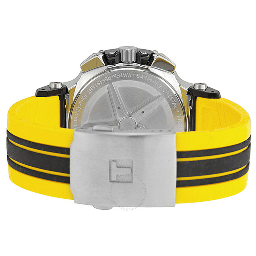 Silver-tone stainless steel case with a black and yellow silicone rubber strap. Fixed silver-tone bezel with a black PVD top ring. Black dial with skeleton hands and index hour markers. Arabic numerals mark the 6, 9 and 12 o'clock positions. Minute markers. tachymeter around the outer rim. Dial Type: Analog. Luminescent hands and markers. Date display at the 3 o'clock position. Chronograph - three sub-dials displaying: 60 second, 30 minute and 1/10th of a second. Quartz movement. Scratch resistant sapphire crystal. Solid case back. Case size: 45.3 mm. Case thickness: 12.5 mm. Round case shape. Fold over clasp. Water resistant at 100 meters / 330 feet. Functions: chronograph, date, hour, minute, second. Casual watch style. Watch label: Swiss Made. Tissot T-Race Chronograph Black Dial Men's Watch T0484172705711.