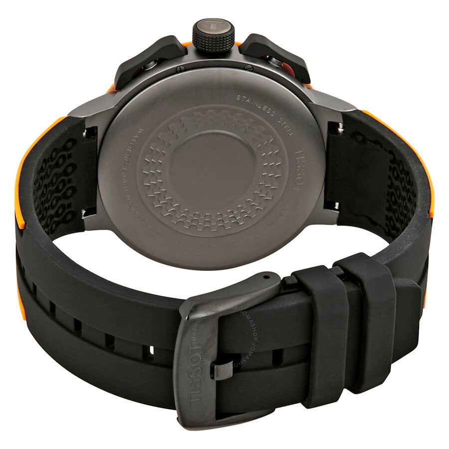 Grey PVD stainless steel case with a two-tone (black and orange) silicone strap. Fixed grey PVD bezel with a black aluminium top ring showing tachymeter markings. Bronze dial with luminous orange hands and index hour markers. Minute markers around the outer rim. Dial Type: Analog. Luminescent hands and markers. Date display at the 4 o'clock position. Chronograph - three sub-dials displaying: 60 second, 30 minute and 1/10th of a second. ETA caliber G10.212 quartz movement. Scratch resistant sapphire crystal. Pull / push crown. Solid case back. Round case shape. Case size: 44.5 mm. Case thickness: 11.4 mm. Band width: 18 mm. Tang clasp. Water resistant at 100 meters / 330 feet. Functions: chronograph, rattrapante, date, hour, minute, small second. Sport watch style. Watch label: Swiss Made. Tissot T-Race Cycling Chronograph Bronze Dial Men's Watch T111.417.37.441.04.