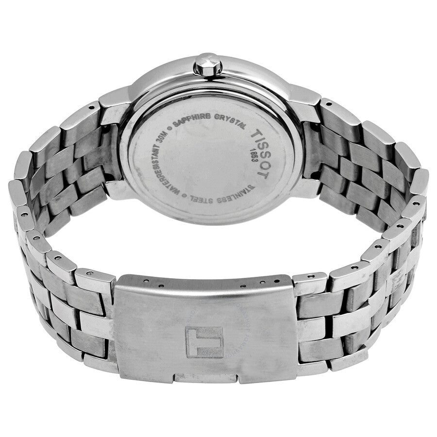 Stainless steel case with a stainless steel bracelet. Fixed stainless steel bezel. Black dial with silver-tone hands and index hour markers. Arabic numeral markers at the 3, 9 and 12 o'clock positions. Date scale around the outer ring. Dial Type: Analog. Month of the year display at the 3 o'clock position. Day of the week display at the 9 o'ock position. Quartz movement. Scratch resistant sapphire crystal. Pull / push crown. Solid case back. Round case shape. Case size: 40 mm. Case thickness: 9 mm. Fold over clasp with a safety release. Water resistant at 30 meters / 100 feet. Functions: hour, minute, second, moon phase, day, month. Txl Moon Phase Series. Dress watch style. Watch label: Swiss Made. Tissot TXL Moon Phase Quartz Black Dial Men's Watch T60.1.484.52.