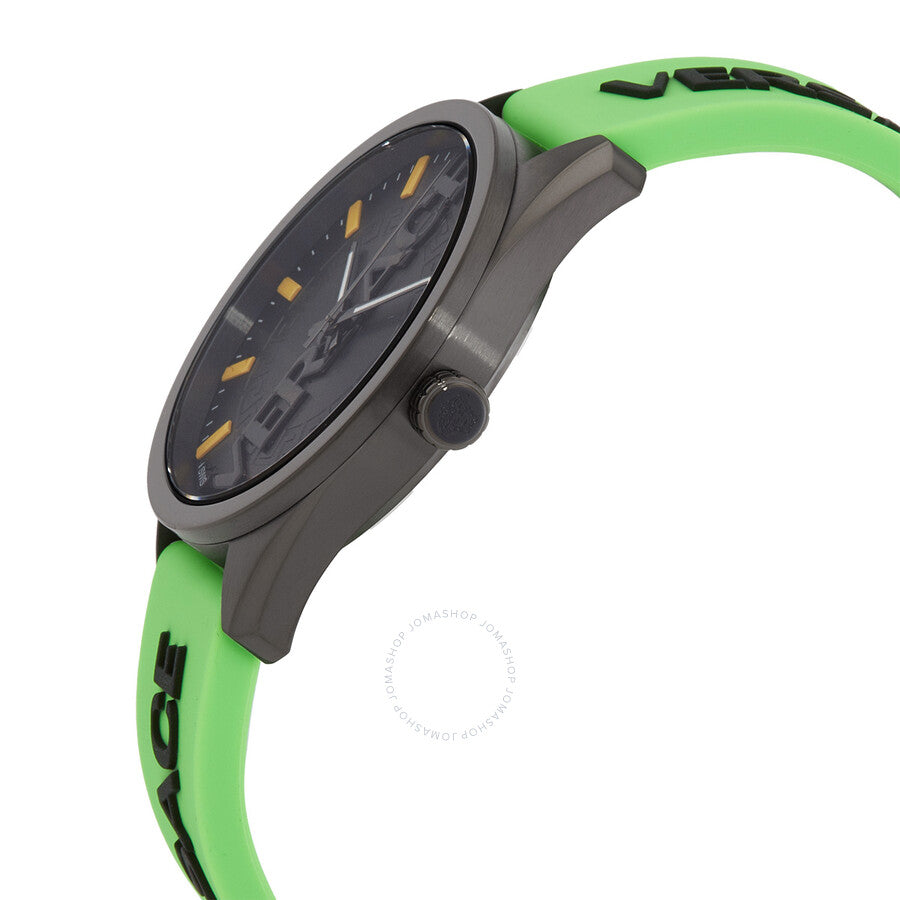 Black stainless steel case with a green silicone strap. Fixed black stainless steel bezel. Black dial with black hands and index hour markers. Dial Type: Analog. Luminescent hands. Quartz movement. Scratch resistant mineral crystal. Solid case back. Round case shape, case size: 42 mm, case thickness: 9 mm. Buckle clasp. Water resistant at 50 meters / 165 feet. Functions: hour, minute, second. V-vertica Series. Sport watch style. Watch label: Swiss Made. Versace V-Vertica Quartz Black Dial Watch VE3H00923.